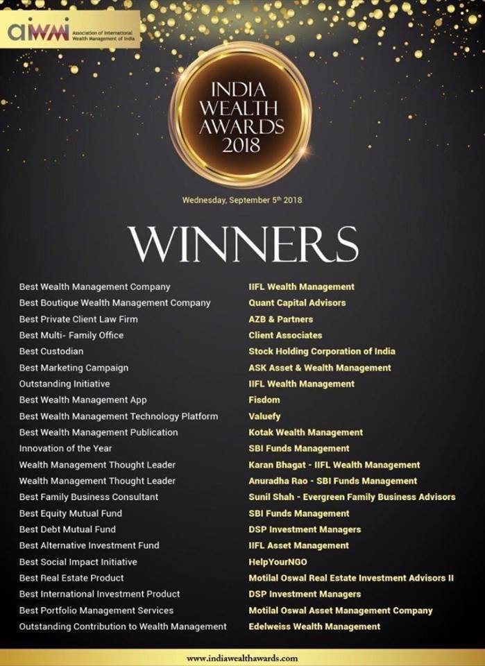 We are proud to share that HelpYourNGO's tailor-made hynGO solution for mutual fund investors - Systematic Giving Plan (SGP) - won the award for the 'Best Social Impact Initiative' at the India Wealth Awards 2018 organized by the Association of International Wealth Management of India (AIWMI).